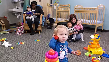 Babies need to be held, loved, and encouraged to safely explore their world. They’ll get lots of cuddles and stimulating activities throughout their day in our care. The Moonlight classroom serves infants ages 6 weeks–12 months. Teachers design experiences based on the baby’s developmental needs and interests.